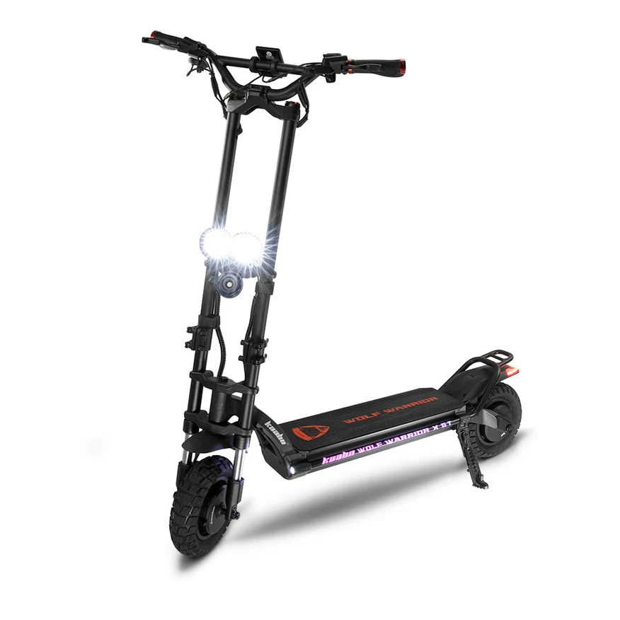 The Kaabo Wolf Warrior X GT Electric Scooter is the next generation of the Wolf Warrior X, with grand touring upgrades to the motor controllers, throttle and display resulting in a sensational street soldier for everyday performance. Being the runt of the Kaabo Wolf pack is what makes this model a super-commuter: the unique dual stem design offers ultra stability but folds down quicker than other beast scooters; and it’s more than 20 lbs lighter yet offers nearly 50 miles of range on a single charge. Powered by dual 1000W motors out of the box and 30A sine wave controllers, the Wolf Warrior GT has a formidable top speed that’s near effortless to control and tons of fun to ride. The Warrior GT adapts well in all environments with street and off-road tire styles and an exceptional lighting package, including front and rear turn signals, bright dual headlamps, and eye-catching sidelights.
