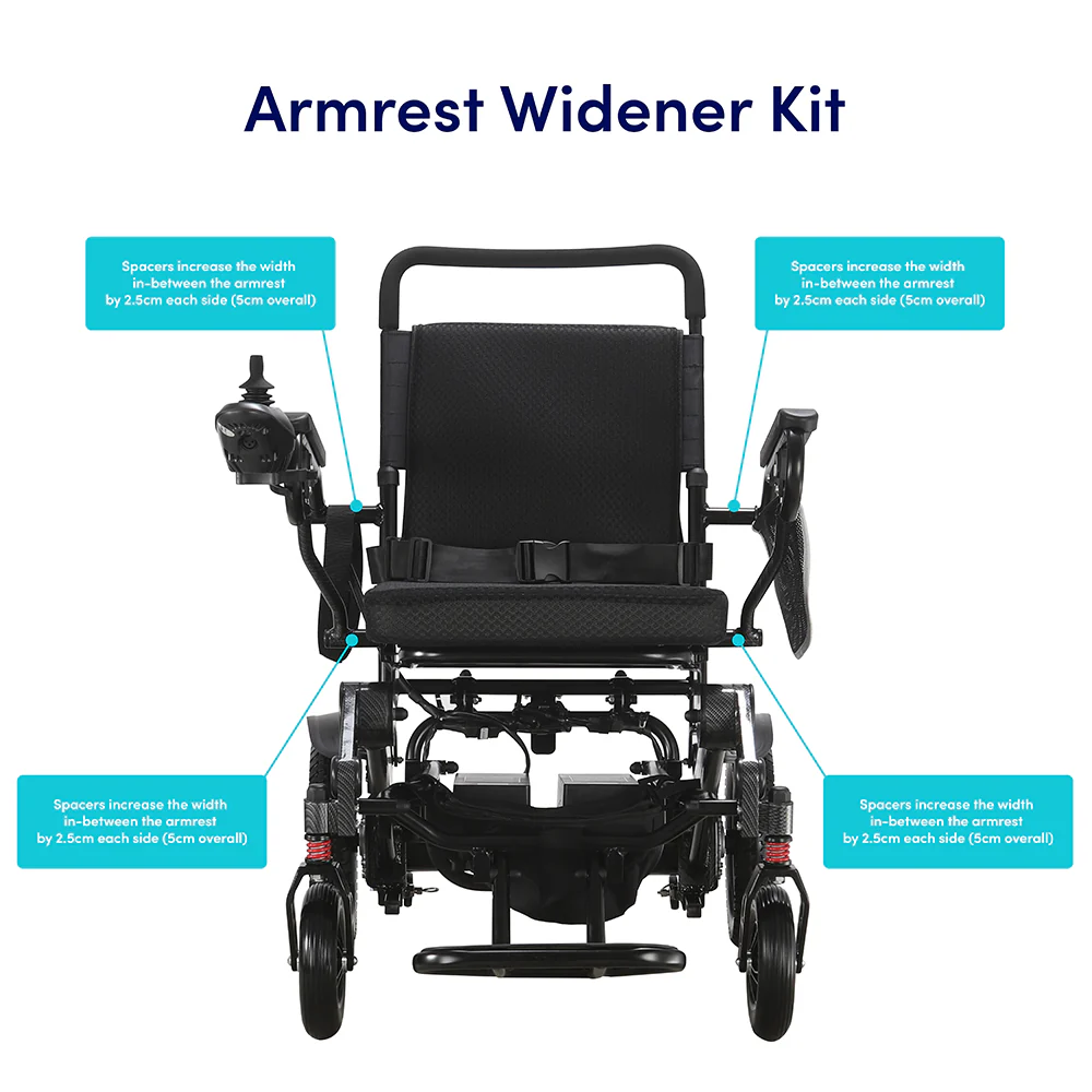 Store personal belongings on-board with a handy under-seat bag, fixed zippered pocket on the armrest and a pouch on the seat back. Armrest spacers are included inside the toolkit which gives the user the option to increase the armrest width by a total of 5cm (2″).