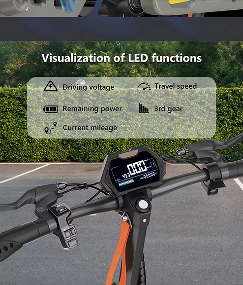Safety is prioritized with dual mechanical disc brakes, an electronic braking system, high-brightness LED headlights, turn signals, and brake taillights. Additional conveniences include a rear cargo box for storage, a Bluetooth speaker for music on the go, and an extra-large central display showing real-time stats.