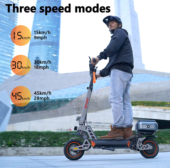 For a smooth ride across various terrains, the scooter is fitted with 10-inch pneumatic off-road tires and features front and rear double swing arm shock absorption. The detachable, adjustable seat provides flexibility between standing and seated riding positions.